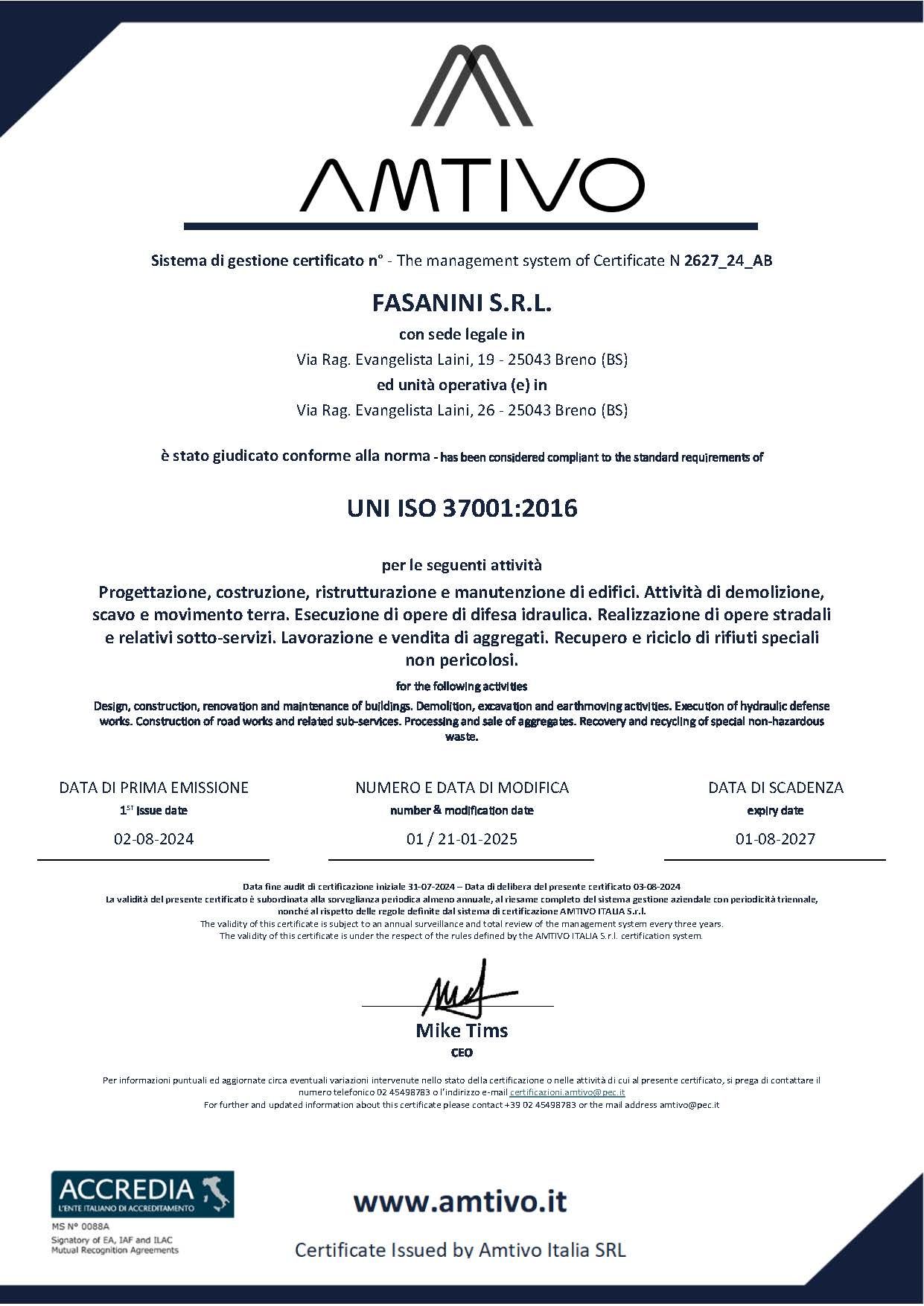 CERTIFICAZIONE SISTEMA DI GESTIONE PREVENZIONE DELLA CORRUZIONE ISO 37001:2016